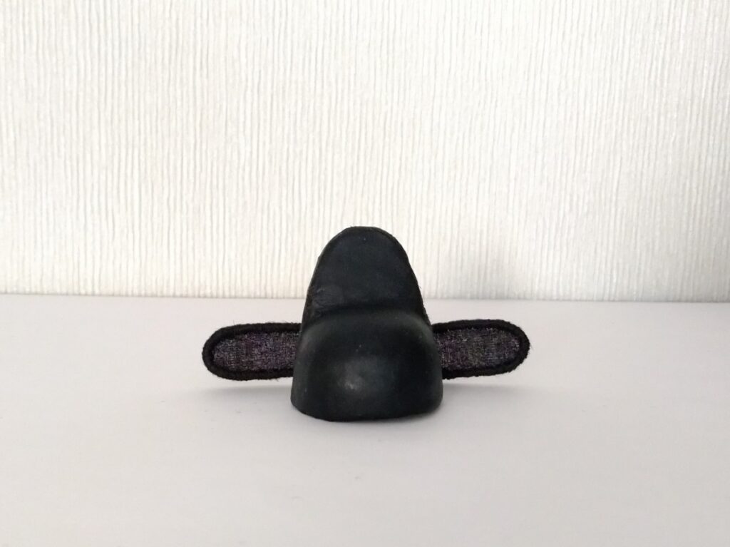 烏紗帽製作中。当初どうやってつくろうか悩みましたが、発泡スチロール球2個と粘土で形を作り、チュール貼り+漆風塗料(後に艶消し)で帽子の土台が完成。 左右の羽根にもチュール(※チュールではなくオーガンジーでした^^;)を貼って、まわりを糸でかがって仕上げます。