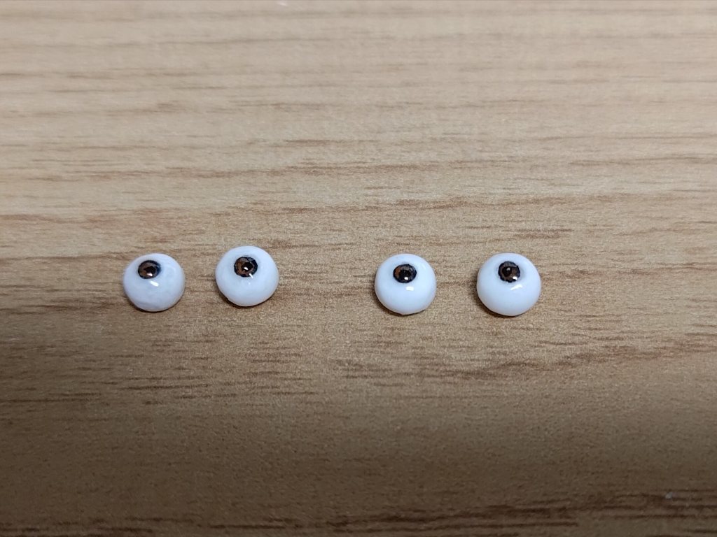 6mmの半球モールドで粘土型取り(できれば5mmにしたかった)→シリコン型→レジンキャストで白目作成。黒目はみ出てきれいに落とせない部分は白を塗り。UVレジンをのせて目をつくってみました。