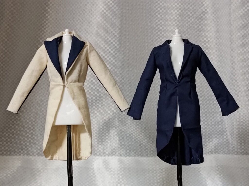 モーニングコートだと前身頃も後身頃もウエスト切替(1のような感じ)だと思いますが、推しの衣装は前身頃が上下続きに見えたため、2でそのように修正。